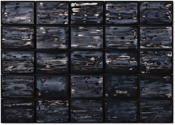 Er lässt den Lack auf wässrigen Lachen treiben, sich ausdehnen, bestimmt die Richtung und wartet den Trocknungsvorgang ab. Er steuert das Brodeln und die Größe der Blasen. Und Marcus Fauser nimmt vom Material auch wieder weg. Bisweilen ordentlich! Das, was er uns zur Anschauung anbietet, kann man freigelegt nennen. Malerei als Archäologie, gewissermaßen. So ist es, wenn Unterseiten nach oben gekehrt, wenn Verdecktes ans Licht geholt werden. Und wie die Archäologie Aspekte des Zeitlichen befördert gilt Gleiches für die Arbeiten von Marcus Fauser.