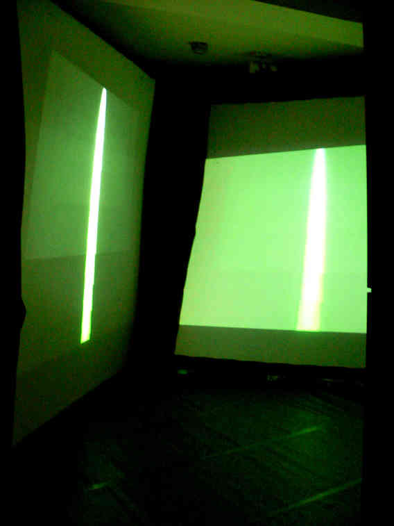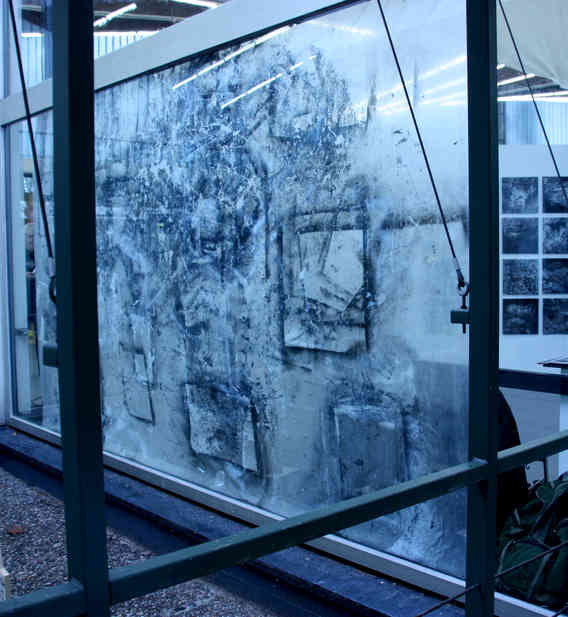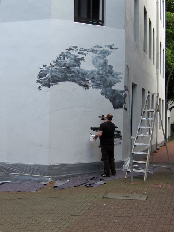 "Eigentlich", sagt Fauser "bin ich Bildhauer". Daher das Entblättern, das Entkernen, das Sichtbarmachen der Vorgänge. Keine Schichten, kein Übermalen. Das Bild, das man sieht, ist ein Hinweis. Auf ein Jahr Arbeit. "Das eigentliche Bild ist nicht ausgestellt", sagt Marcus Fauser - und man ahnt, dass der Hinweis auf der Einladungskarte "im Anschluss offene Ateliers" im besten Sinn ernst und als Fortführung dieser Präsentation gemeint ist. Der Boden, die Plane, fehlen noch die zwei weißen Leinwände. Projektionsflächen hier, die möglichen Entstehungsabläufe möglicher Bilder simulierend. 40x40 oder 50x50 - das sind die Maße, darauf projiziert die Bildbewegung, die fließt und in einem bestimmten Moment eingefroren wird. Zulassen und Kontrollieren - ein Vabanquespiel, das die Kunst seit jeher faszinierte.